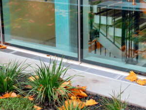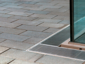 Allproof’s Perimeter drain was used as the level threshold solution at the entrance to the atrium and lower-level podium, providing an accessible entryway. The 316-grade stainless steel wedge wire grate was selected to provide a premium aesthetic while also benefiting from its design features such as heelproof grating and an R11 slip resistance (AS4586). In this area, the glazing selection resulted in the sill of the window protruding beyond the glazing line, below the paved level. In order to maintain the required 12mm gap, Allproof provided a customised fold from the grating to span this sill and create a detail that satisfied both form and function.